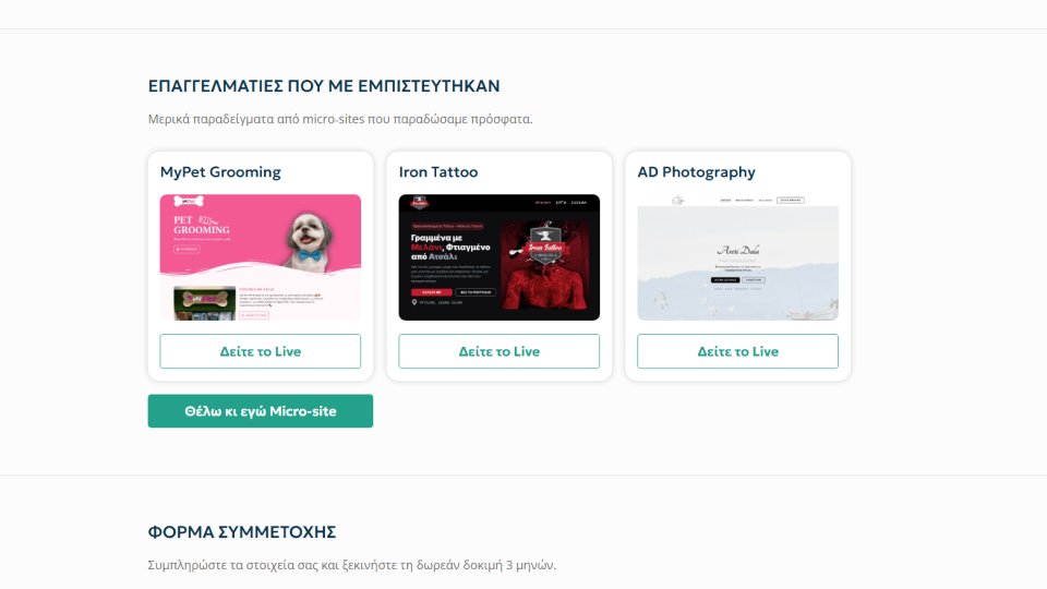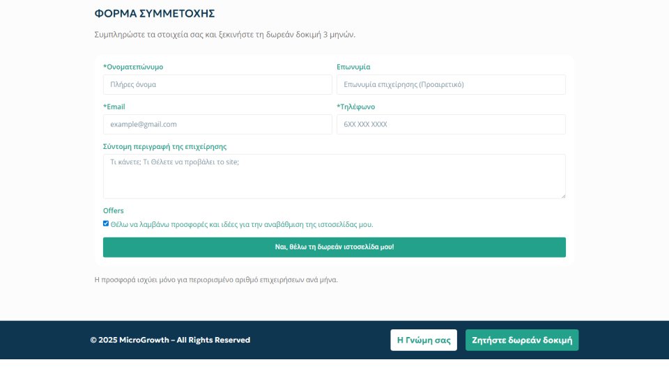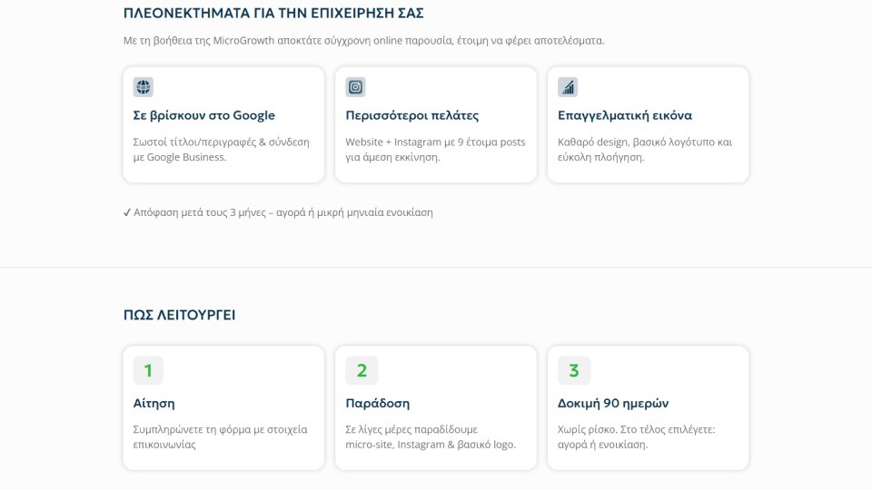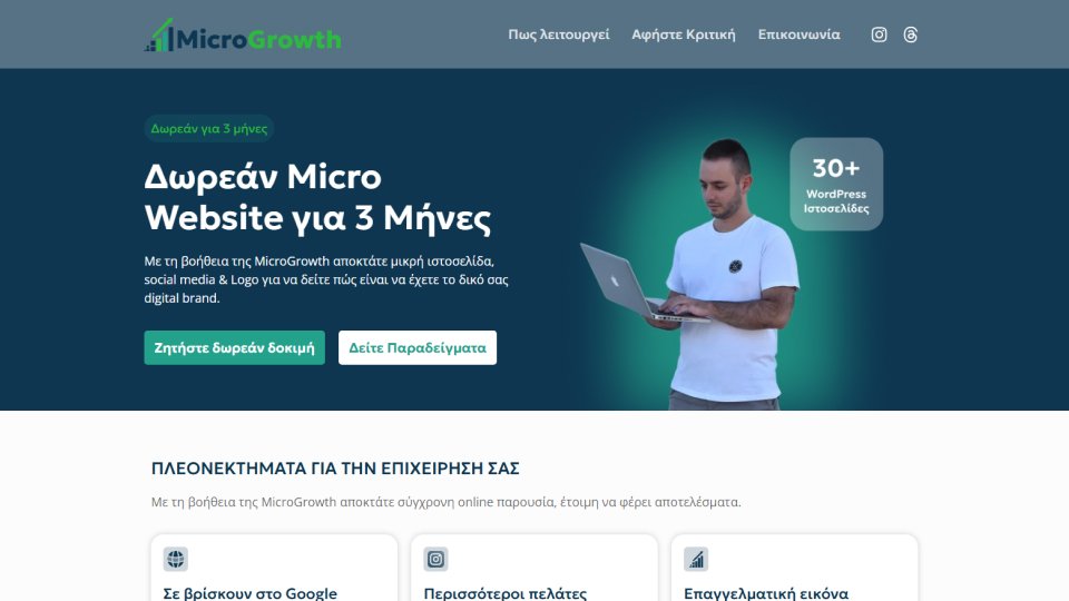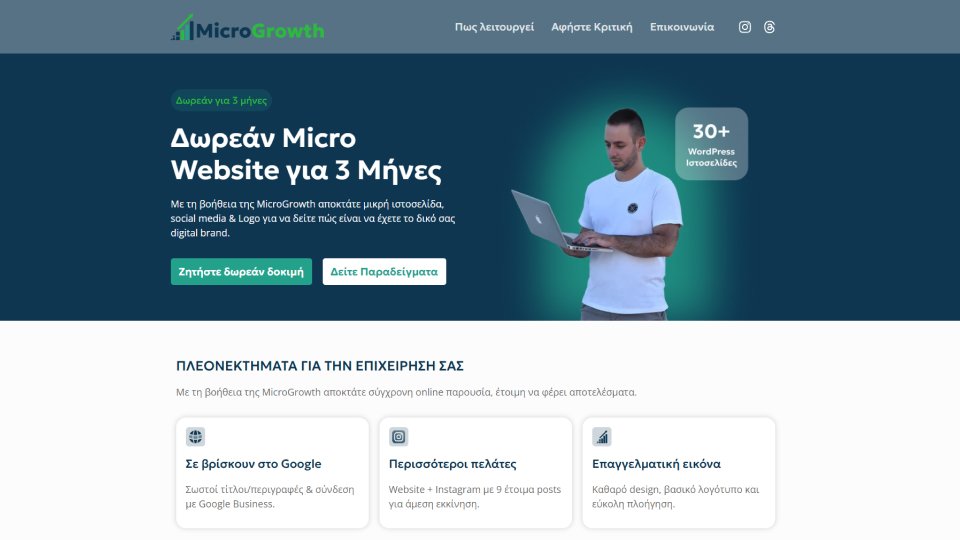 Το MicroGrowth είναι μια πλατφόρμα που σχεδιάστηκε για να δώσει στις μικρές επιχειρήσεις έναν εύκολο και προσιτό τρόπο να αποκτήσουν τη δική τους επαγγελματική ιστοσελίδα — χωρίς μεγάλο αρχικό κόστος, περίπλοκες διαδικασίες ή τεχνικές γνώσεις.